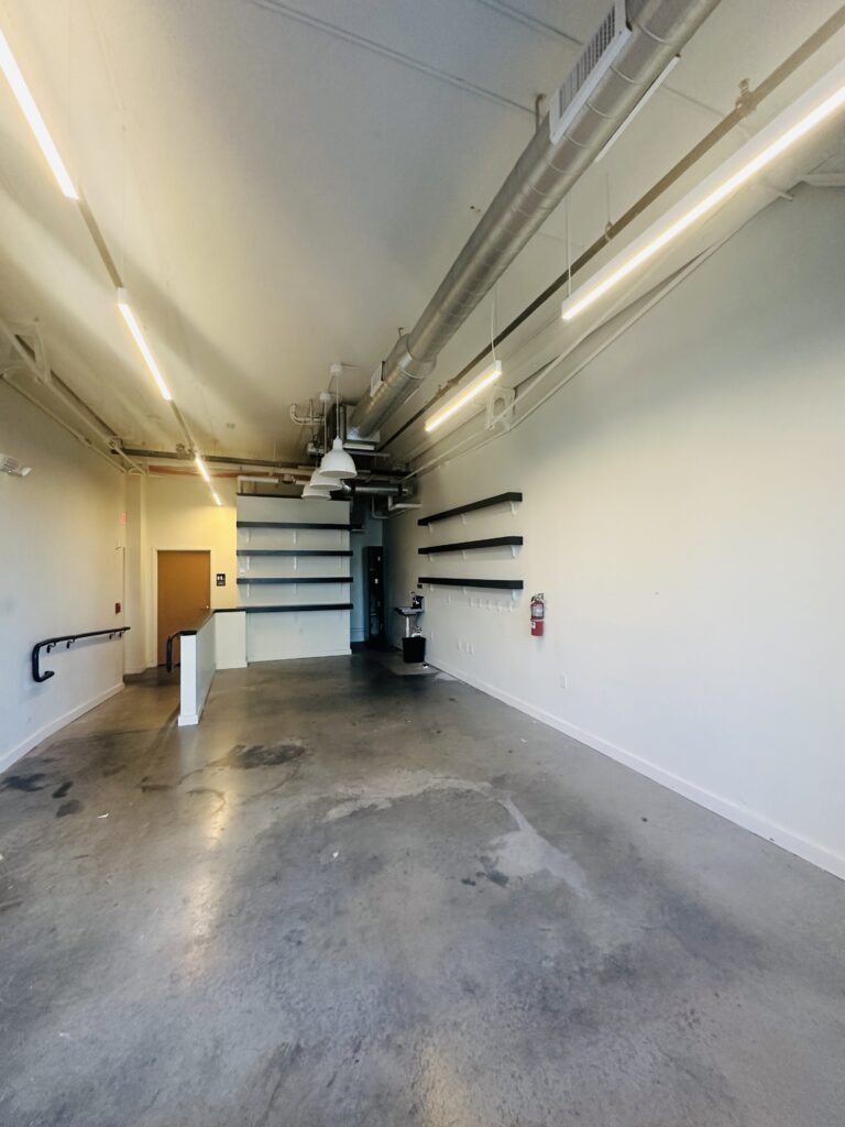 The storefront is a cafe space only. An adjacent shared commercial kitchen is $20/hr, where you will have priority in booking time. There is cold or dry storage available for an additional monthly fee if needed. See pictures below.